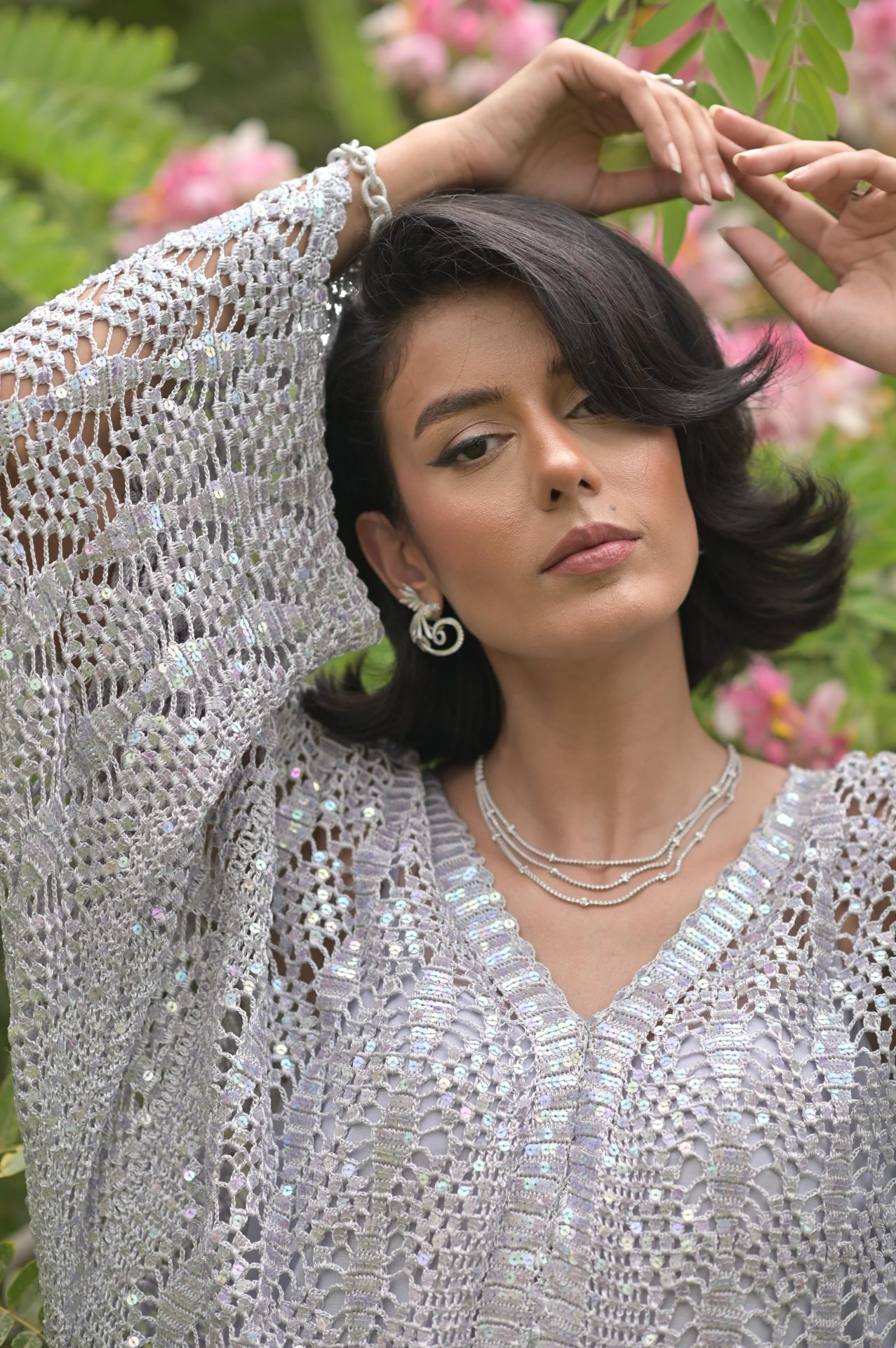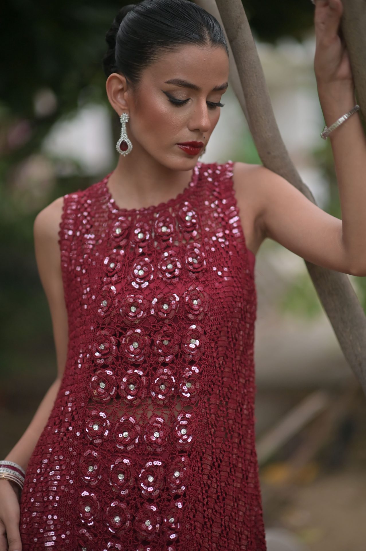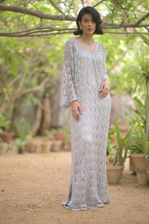 52 to 54 inch Ivory crochet Shirt with Gold sequins, center Panel and daaman crocheted with double Floral pattern with inlay of crystals. The Shirt is edged with a scalloped crochet border. Crochet sleeves can be added.
